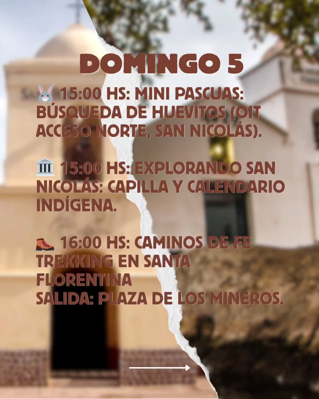Conocé las actividades que Chilecito tiene para vos. Búsqueda de huevitos, Explorando San Nicolás, Trekking en Santa Florentina.